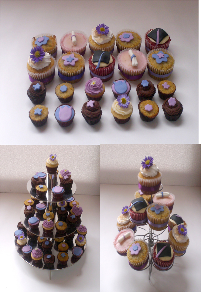 Además, he estado trabajando en los cupcakes que se servirán como postre en la fiesta de grado de María Carolina, son 30 cupcakes grandes de 5 sabores y 80 minis de 4 sabores, decorados en tonos morados, con motivos de flores, flores naturales, virretes y diplomas.