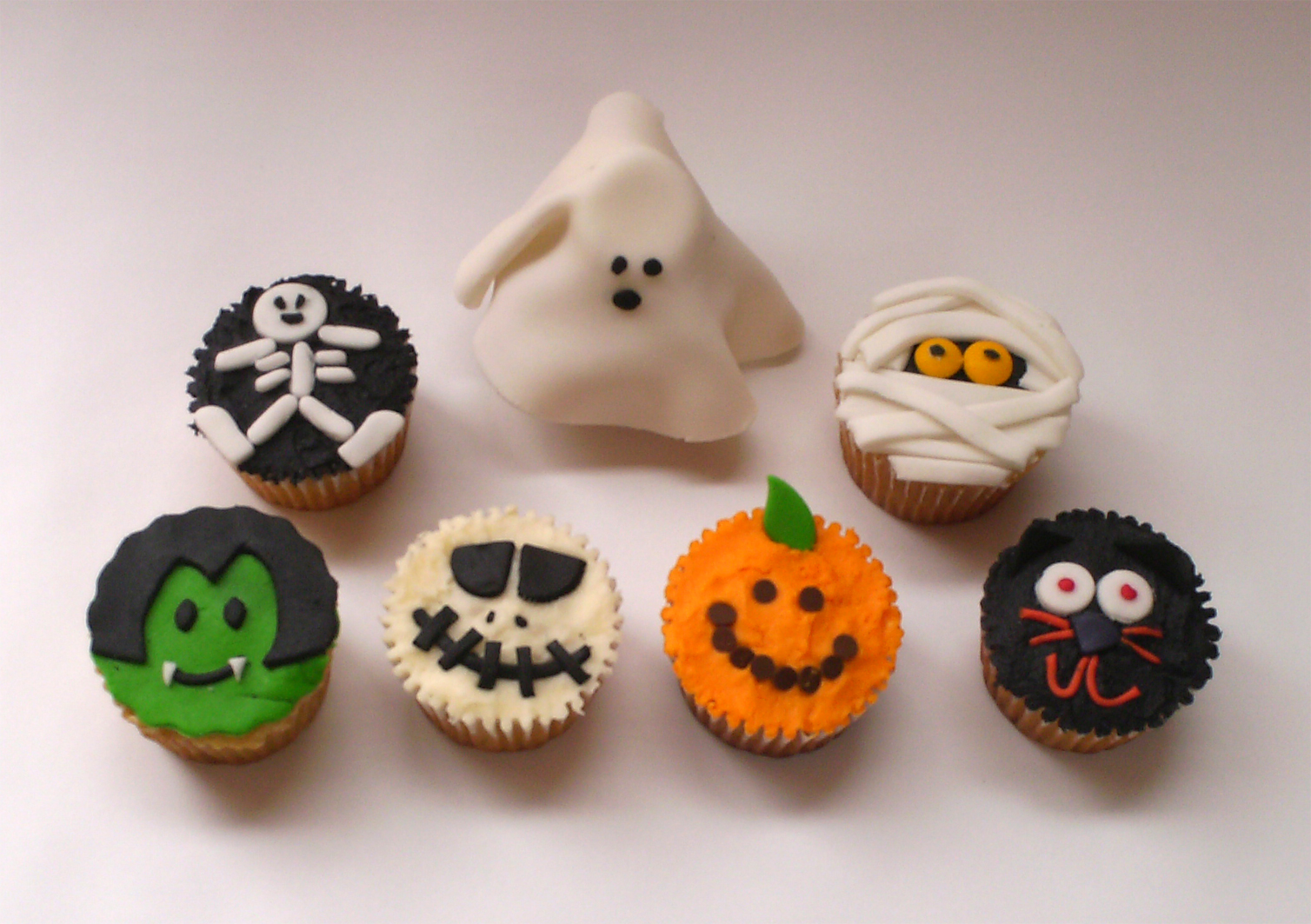 Les presento al esqueleto, el fantasma, la momia, el vampiro, Jack, la calabaza y el gato negro, cupcakes de vainilla decoradados en pastillaje, algunos con cubierta de mantequilla y detalles en pastillaje y chips de chocolate.