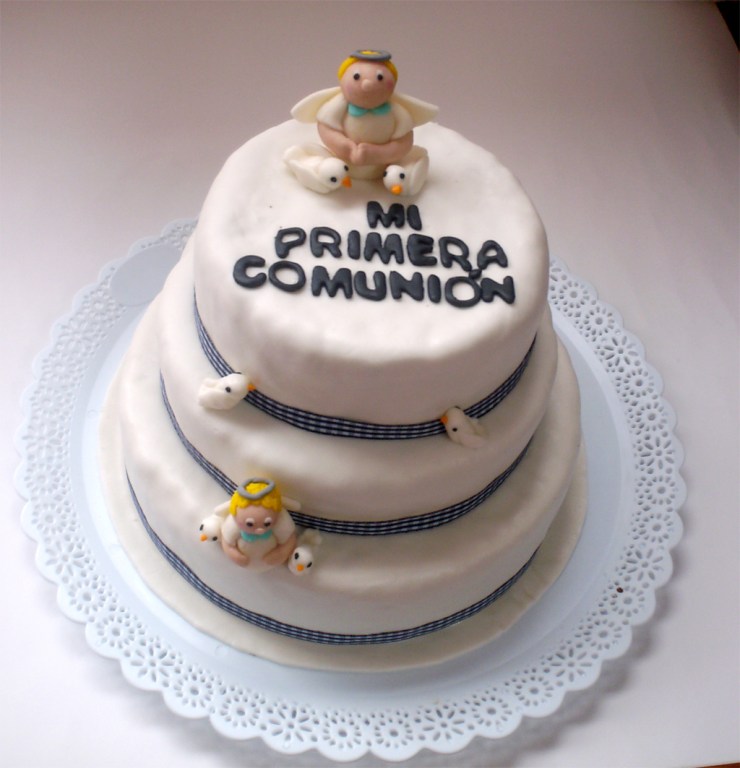 Hoy quiero compartir una foto de la primera torta de primera comunión que hacemos. Es una torta negra, de 3 pisos, 2 libras, para 60 personas. Está decorada con pastillaje, con angeles regordetes y palomitas. Mi hija dice que son pollitos pingüinos, pero son palomas. Mañana en la mañana la recogen, es para la fiesta del sobrino de Marcela, la directora del jardín de Antonia.