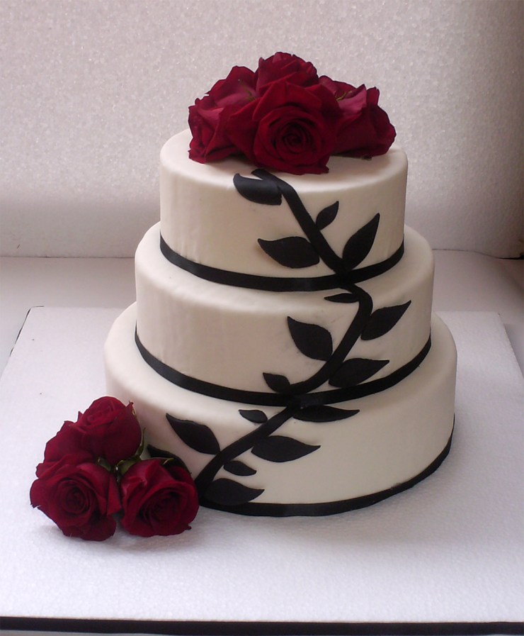 Maqueta de torta de 3 pisos, decorada con flores negras en pastillaje y rosas rojas naturales.