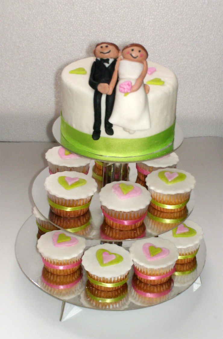 Set de torta y cupcakes a juego decorados en pastillaje. Pareja de novios moldeada 100% a mano.