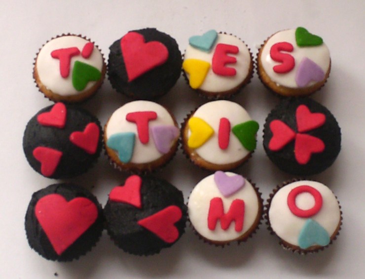 Hoy comparto con ustedes la foto de los cupcakes que me encargó Laura para regalarle a su novio por su aniversario. Son de vainilla, con cubierta de mantequilla, letras y corazón en pastillaje y alrededor tienen sprinkles de corazones.