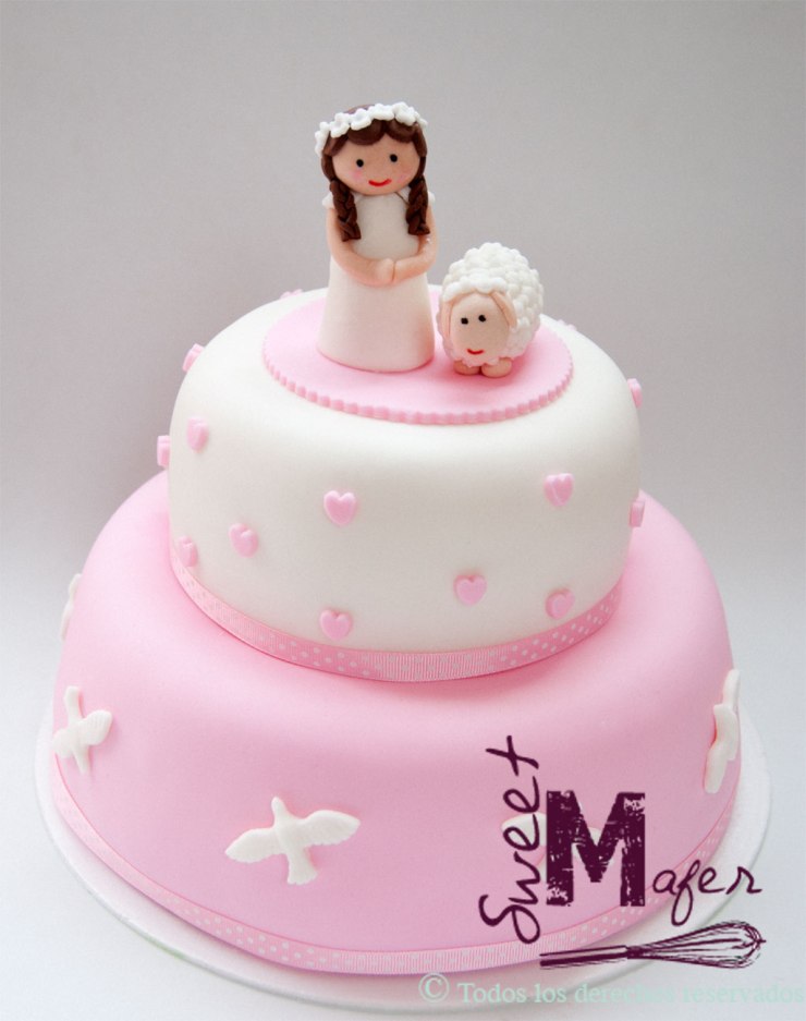 Torta rosa con florecitas blancas, cinta lila de pepitas blancas y niña vestida de primera comunión.