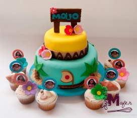 Le hice torta negra, con la receta de la tía Pacha, porque fue la que me pidió, para las amigas cupcakes de vainilla y chocolate, y galletas, todo decorado con corazones, estrellas y galletas de Mr. Wonderful.