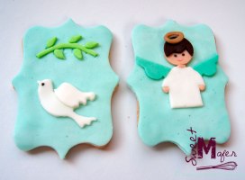Felipe hizo la primera comunión y su mamá me encargó 40 galletas para los recordatorios, hicimos unos marcos vintage, con palomitas y ramas, y otras con angelitos, en tonos azul claro, aguamarina y blanco. ¡Les encantaron!