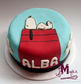 Juan José quería sorprender a su mamá que estaba de cumpleaños con una torta de Snoopy, su personaje favorito. Me encargó una torta de 6 porciones de almendra y naranja decorada con la casita de Snoopy y él acostado sobre ella. Me escribió para darme las gracias y a contarme que su mamá estaba muy emocionada.