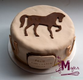 Vanessa me encargó esta torta de chocolate con arequipe para 10 personas para el cumple de su amiga Jeidy, quería una torta beige con la silueta de un caballo, un marquito con el nombre y algunas herraduras alrededor y eso fue exactamente lo que hicimos para ella.