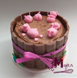 Carlos me encargó esta torta marmolada para 6 personas, cubierta con chocolate y decorada como una pileta de cerditos, el animal favorito de su esposa.