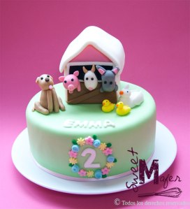 Mónica me encargó esta torta de granja para el cumple de sus gemelas Valeria y Mariana, era una torta de chocolate para 30 personas y tenía un cerdito, una vaca, una gallina y un pollo, dos patos y un caballo. Quedó muy feliz con el resultado.