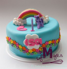 La semana pasada hice esta torta de Mi pequeño Pony (My little Pony) para la hijita de Idun. Es una torta de chocolate para 25 personas, cubierta en azul, rodeada con flores de colores y encima tiene un arcoiris y un pony de juguete. Quedó muy linda y alegre y a ella le encantó.