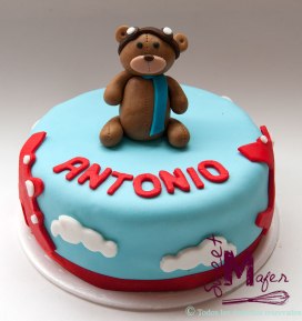 Ya hemos hecho varias tortas para baby shower con temática de aviones, esta vez hicimos una torta muy tierna, decorada con nubes y aviones, y con osito aviador sentado en la parte superior. Es una torta de 25 porciones, en vainilla con mora, decorada en azul suave, blanco y rojo.