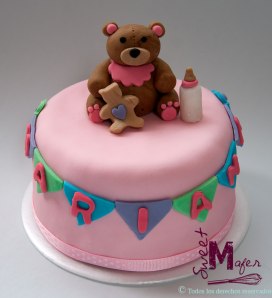 María me encargó esta tortica de vainilla con arequipe para 6 personas, para una pequeña reunión con sus amigos, para celebrar un baby shower para Mariana, hijita de una amiga suya. Le pusimos un banderín con el nombre y un osito con babero, tetero y un osito de peluche.
