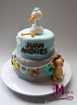 Carolina me encargó esta linda torta para el baby shower de Juan Andrés. En la parte de arriba tenía una cigüeña sentada con un bebé abrazado, abajo estaba rodeada de ropita de bebé colgando y tenía un león queriendo subirse a la torta. Decorada en tonos azules y grises, con toques amarillos y menta, era una torta de 16 porciones en masa marmolada y a Carolina le encantó!