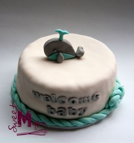 Maribel me encargó esta torta y cupcakes a juego para el baby shower de su sobrinito. Eligió la temática de ballenas, hicimos una torta para 10 personas de vainilla con mora, decorada en blanco con una cuerda azul claro y una ballena en la parte superior, y cupcakes en tonos a juego con ballenitas para enviarle a los tíos y abuelos del bebé.