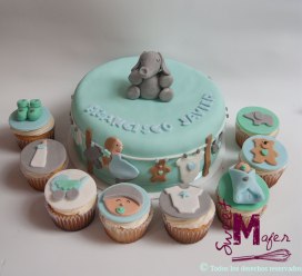 Dayana, a quien hice su torta de boda hace dos años, organizó un baby shower por la llegada de su bebé, Francisco Javier, y me pidió una torta y cupcakes a juego, decorados en tonos azul, verde, amarillo y gris. Quedó muy contenta con el resultado.