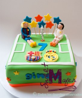 Ginesito cumplió 7 hace unos días, para celebrarlo, su mamá, Leonor, le organizó una fiesta de fúbol con sus amigos. Ginesito y su papá son hinchas del Real Madrid, pero unos pocos días antes de la fiesta, Ginesito decidió que ahora le gusta más el Barca. Sin embargo, y para no poner triste a su papá, quiso que la torta tuviera los dos escudos y dos jugadores de fútbol con los uniformes de cada equipo.  Ginesito es hermano de Sofía, una de las mejores amigas de mi hija. Su mamá quedó muy contenta con el resultado de esta torta de vainilla para 20 personas.