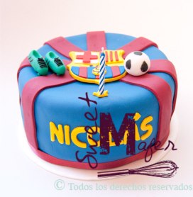 La semana pasada Leny, me encargó esta torta para 10 personas, marmolada, para la celebración del cumple de su esposo Nicolás. Como es hincha del barca, la decoramos con el escudo, un balón y unos guayos. A Leny le gustó mucho cómo quedó.