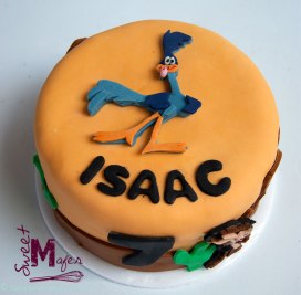 María Jimena me pidió esta torta de 6 porciones de chocolate para la celebración en casa del cumpleaños de su hijo Isaac, decorada con el correcaminos y el coyote.