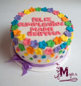 María Lorena me pidió esta torta marmolada de 10 porciones, decorada con flores de colores para el cumpleaños de su abuelita. ¡Le pareció muy linda!