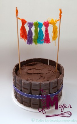 Luciana cumplió 13 y su mamá me encargó una torta de zanahoria y esta torta de chocolate, decorada con chocolatinas y un banderín con borlas de hilo. Patricia le organizó una reunión con sus amigas y encargó esta tortica especialmente para Luciana. Le encantó!