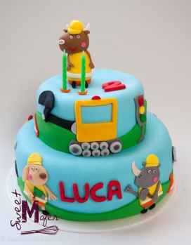 Maxi cumplió 3 años, y su mamá, Claudia, quiso organizarle una pequeña celebración en casa, me pidió una torta de chocolate con capa de mora para 10 personas, decorada con temática de construcción, le pusimos conos, piedras, una mezcladora y una retro excavadora. Quedaron muy contentos con el resultado.