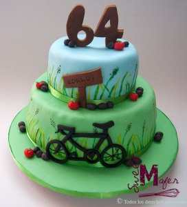 Maribel es una vieja amiga y clienta de Sweet Mafer, en esta oportunidad, me encargó una torta para el cumple de su papá, a quien le encanta el ciclismo. Hicimos una torta de vainilla con mora para 30 personas, la decoramos con pastos, una bicicleta, un aviso con el nombre de Monroy y un 64 en la parte de arriba, además de algunas piedritas y manzanas. ¡Le gustó mucho!