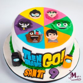 Santi es un cliente muy especial de Sweet Mafer, hemos hecho sus tortas de cumpleaños desde que cumplió 5 y este año cumplió 9. El primer año hicimos una gran torta de Lego, el segundo dos tortas del mundial de Rusia, el tercero una de ajedrez y otra de fútbol, el año pasado una de Minecraft, y este año, su mamá, Patricia, nos encargó una torta de Jóvenes Titanes con unos personajes de Among Us en la base. Hicimos una torta de 15 porciones de chocolate con mora y les encantó. La torta tiene 6 Titanes en vez de 5, el Titán que está sobre la parte naranja es Santi.