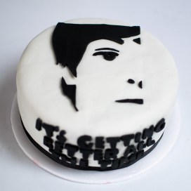 Mi esposo cumplió años hace poco y quería una torta de Paul McCartney. Le hice esta torta de chocolate, rellena de mermelada de frutos rojos, decorada con la silueta de la cara del cantante y estaba feliz.