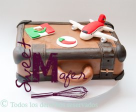 Al cuñado de Lina lo trasladan a México por trabajo, le hicimos esta linda torta, en forma de maleta antigua, con un avión, la bandera mexicana y un sticker de un ají. Era una torta de chocolate para 20 personas, Lina escribió para contarme que la torta fue un éxito y que les encantó.