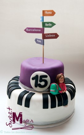 Sofía es hija de Samar, una buena amiga de mi amiga Claudia, fue ella quien me encargó la torta y se la regaló a Sofía por sus 15 años. Querían un piano en la parte de abajo, una muñequita con su morral y arriba señales con nombres de ciudades europeas porque Sofía se va de viaje de 15 años a Europa. Era una torta de vainilla con arequipe para 25 personas y les gustó mucho, Samar me escribió para agradecerme.