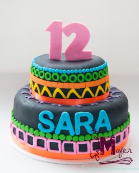 Sara cumplió 12 años y su mamá, Natalia, me encargó esta torta de vainilla con capa de chocolate para 25 personas, decorada en negro con figuras geométricas en tonos neón.