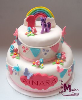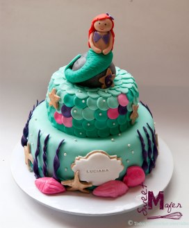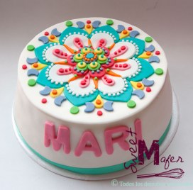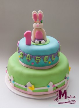 Stella cumplió años, es hija de unos vecinos, y su mamá me encargó esta torta de vainilla, para 16 personas, decorada con la carita de una osa panda y flores en los colores favoritos de la niña, azul y aguamarina. ¡Les gustó mucho!