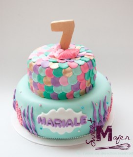 Para el cumple de Mariale, su mamá me pidió una torta con temática de sirena. En el piso de abajo hicimos un paisaje marino con algas, plantas y estrellas de mar, y un marquito con su nombre, y el piso de arriba lo forramos con escamas redondas de pastillaje en tonos agua, menta, rosas, lila y dorado. Encima pusimos el 7 y unas conchitas. Era una torta de chocolate, con capa de crema de chocolate para 25 personas. La recogió Gonzalo, su papá, y quedó muy contento con el resultado. Unos días más tarde, su mamá me escribió para agradecerme, les encantó.
