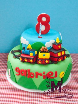 Gabriel celebró su cumple el fin de semana pasado, su mamá Nubia, me encargó esta torta de tren, con un trencito moldeado al frente. Gabriel fue compañero de colegio de mi hija Antonia y conocemos a su familia desde hace unos años. ¡Gabriel quedó feliz con su tren!