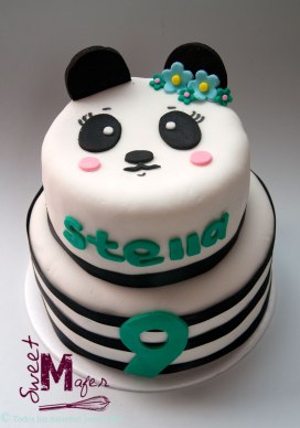 Stella cumplió años, es hija de unos vecinos, y su mamá me encargó esta torta de vainilla, para 16 personas, decorada con la carita de una osa panda y flores en los colores favoritos de la niña, azul y aguamarina. ¡Les gustó mucho!