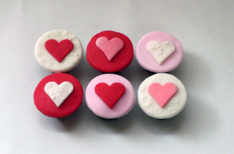 Cupcakes de vainilla decorados con pastillaje, algunas tapas y corazones tienen textura de flores. Disponibles en cupcake y minicupcake. Caja por 6. Valor caja cupcakes $23.000, caja minicupcakes $12.500.