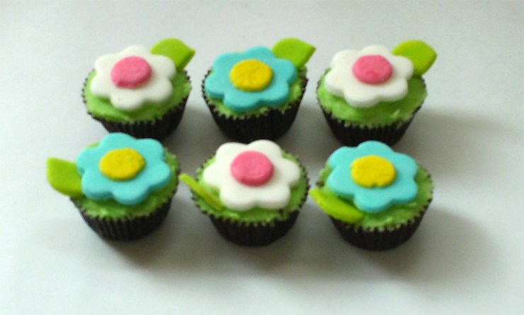 Cupcakes de vainilla con cubierta de mantequilla y flores hechas en pastillaje. Se pueden hacer de cualquier color. Disponibles en cupcake y minicupcake. Valor unidad cupcake $3.800, unidad minicupcake $2.000.