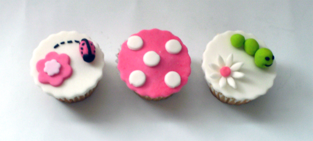Cupcakes de vainilla decorados con pastillaje, con motivos de insectos amistosos y flores. Disponible en cupcake tamaño regular. Caja por 3, por 6 o por 9. Valor unidad $4.300.