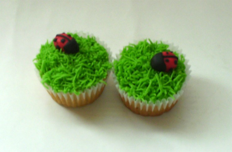 Cupcakes de vainilla, con cubierta de mantequilla formando pasto y mariquitas hechas en pastillaje. Disponible en cupcake tamaño regular. Valor unidad $4.300.